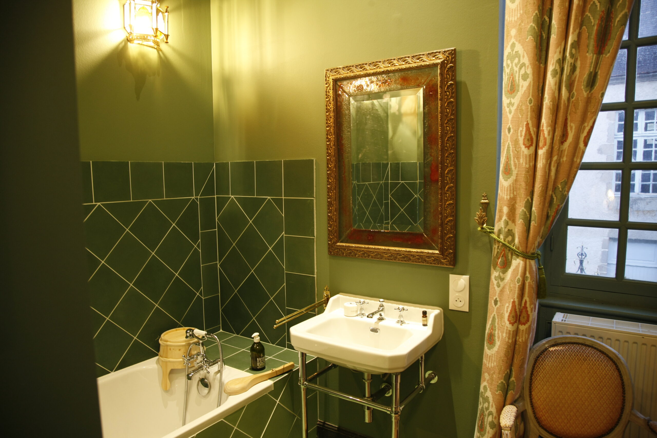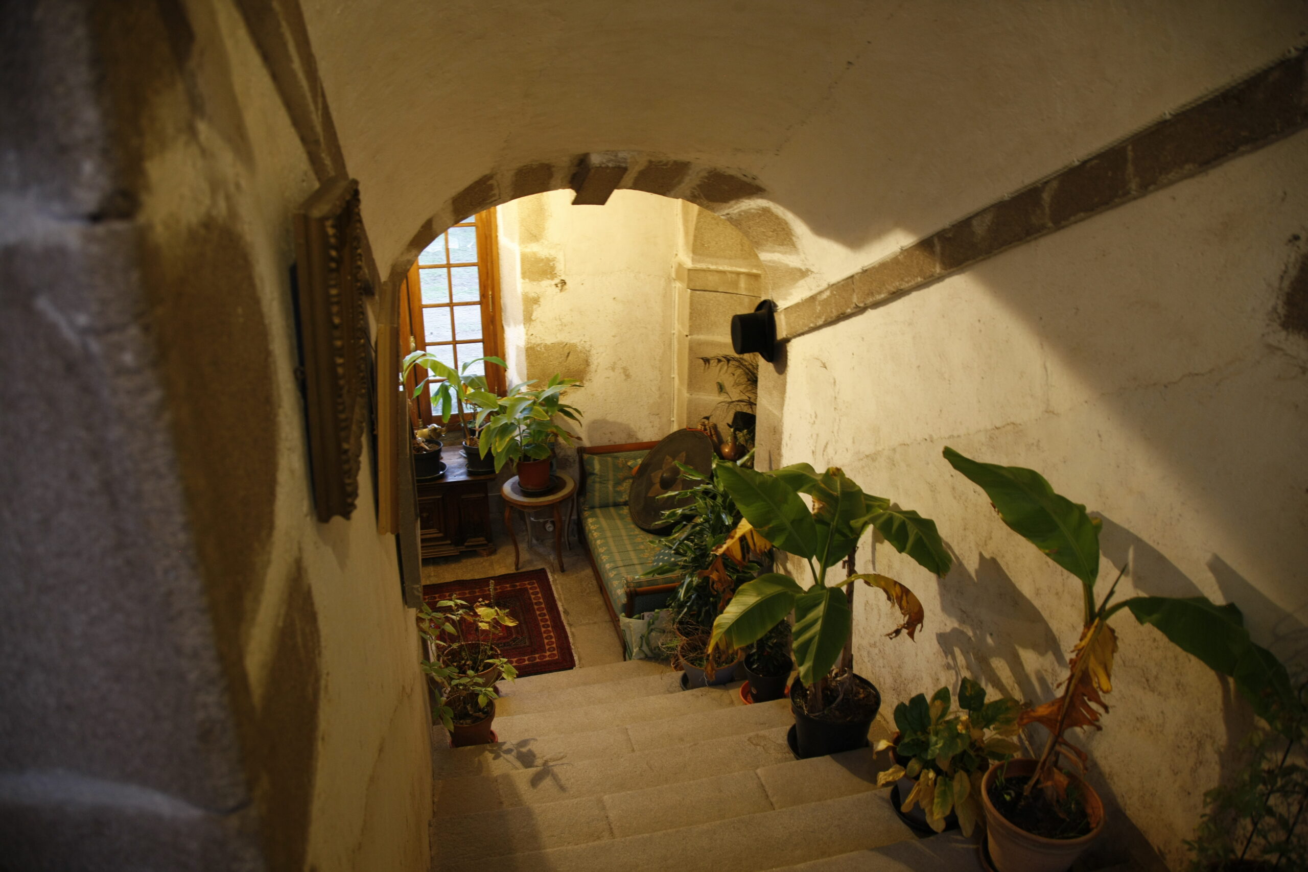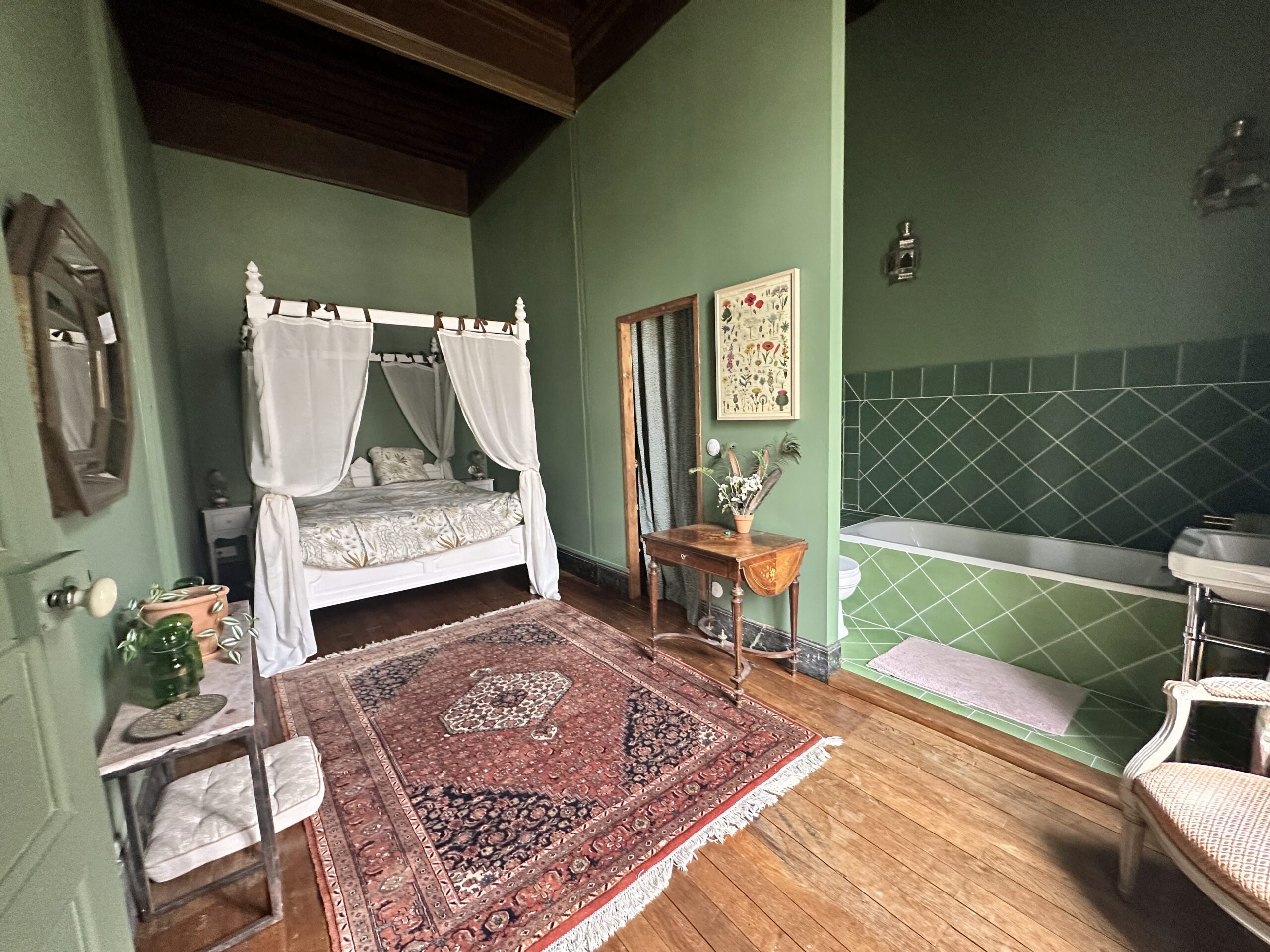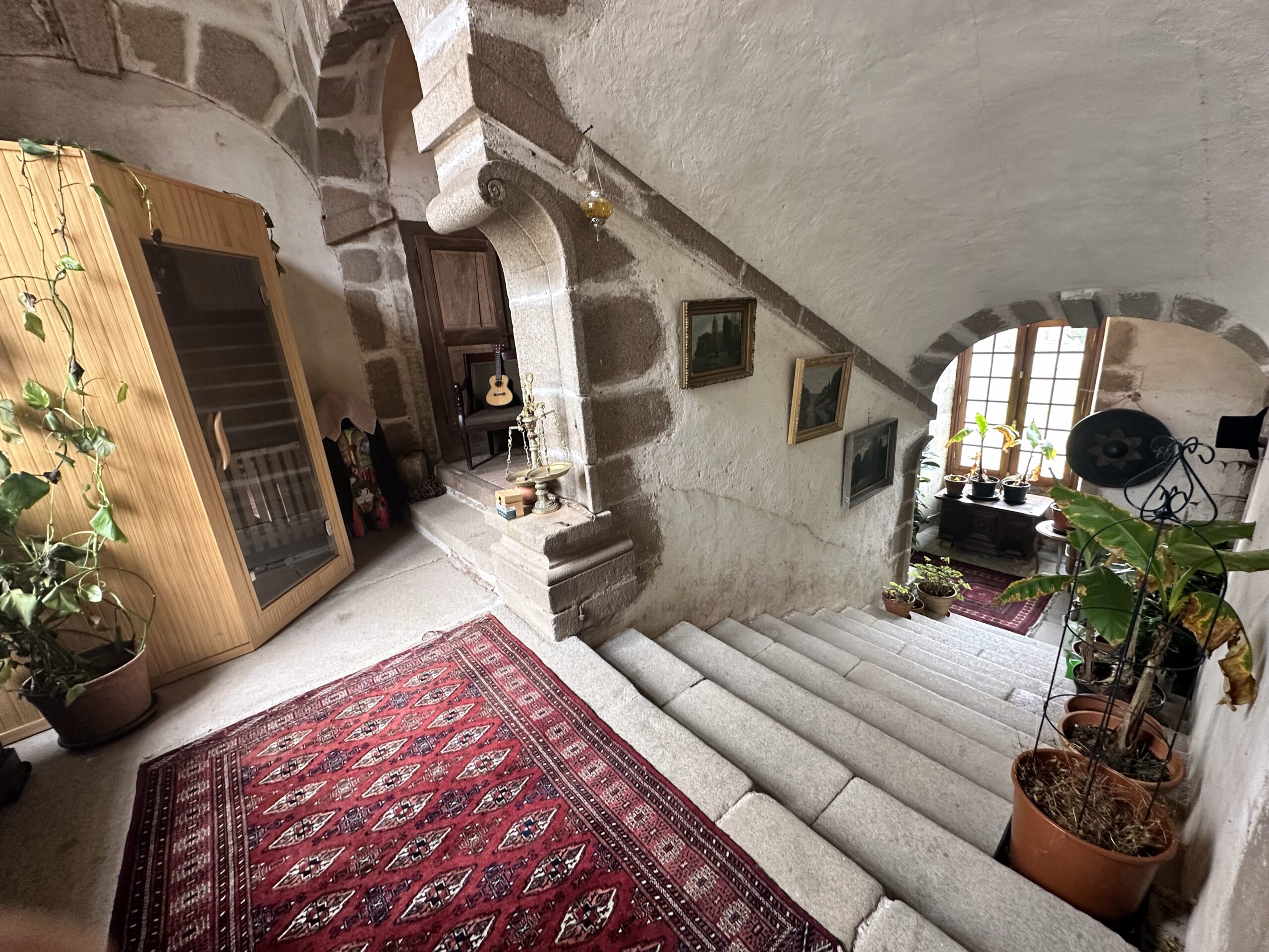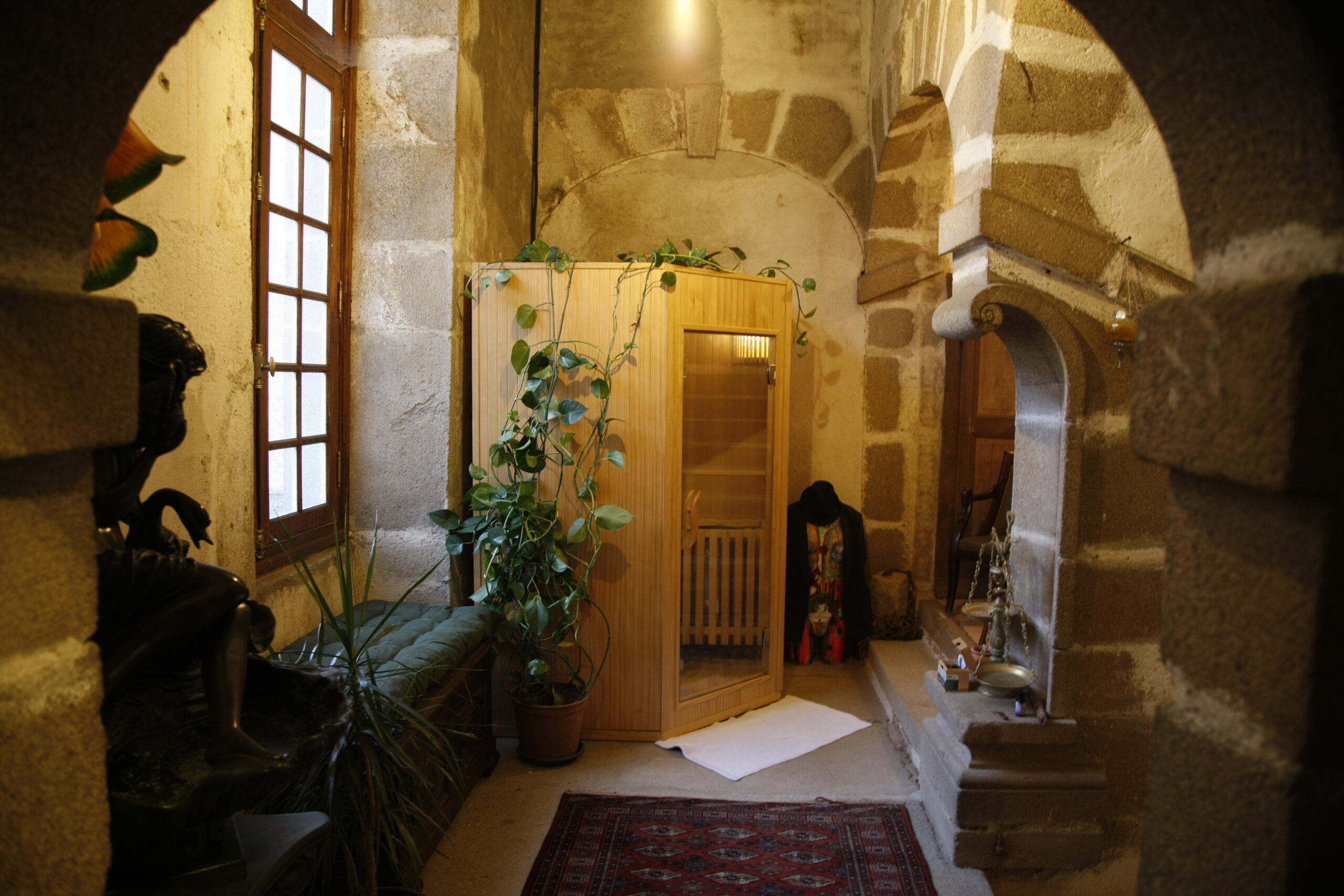 This suite is reached via a large, medieval granite staircase, also a national treasure. The bedroom (18 m2) with parquet floor, carpets, four-poster king size bed and integrated bathroom (bath, washbasin, toilet) is spacious and heated. The entire staircase belongs privately to this suite, in which there is a sauna for two people, seating and lots of plants. One floor up, there is another, smaller bedroom for two people (view of the castle park), which can be rented on request.
