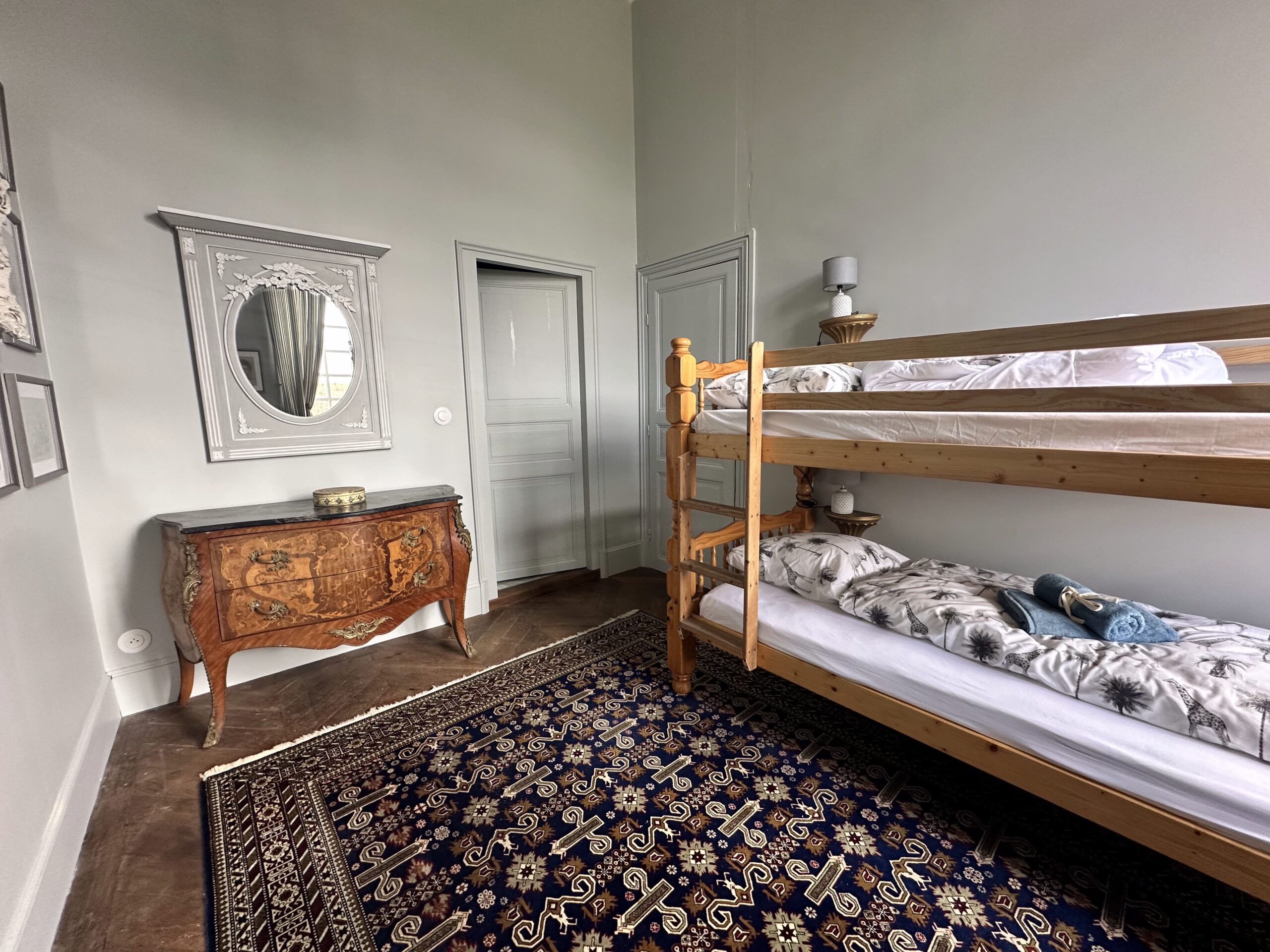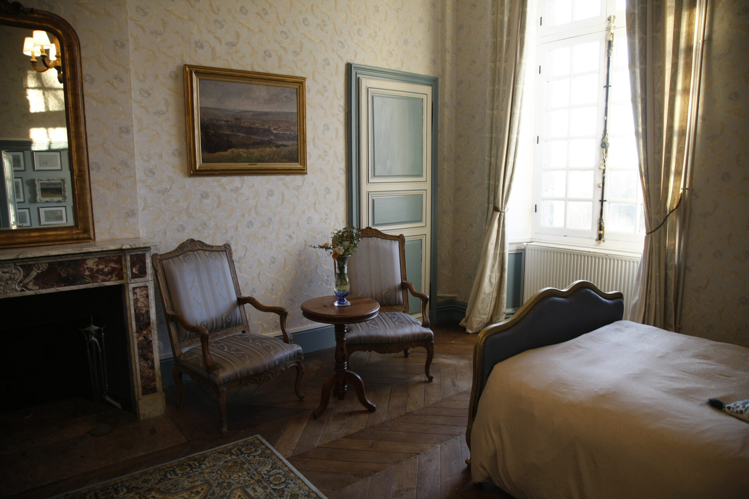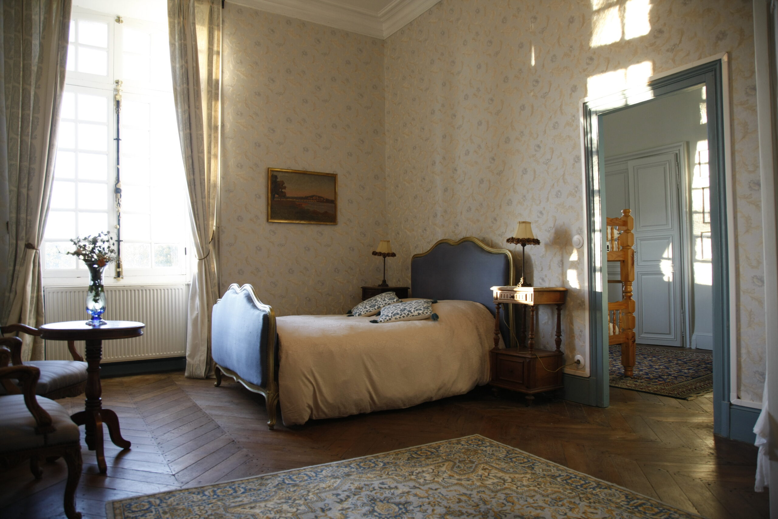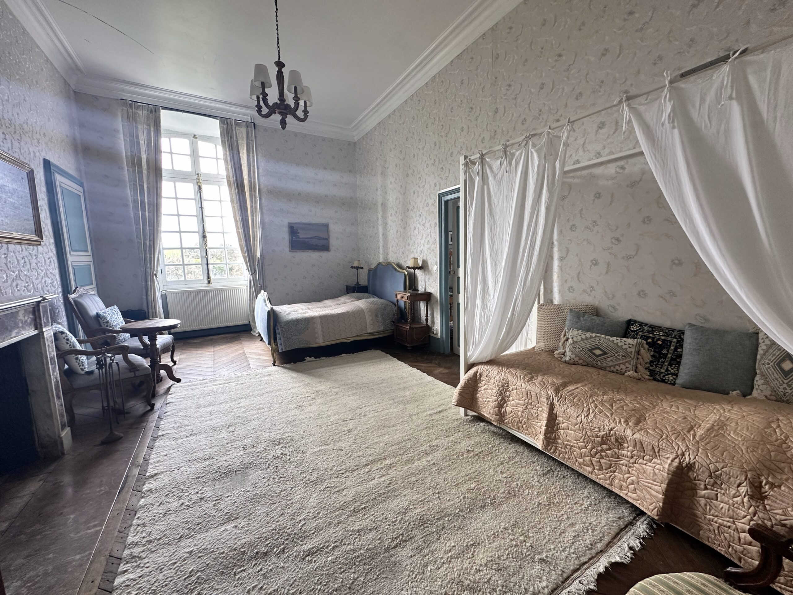 This spacious and heated suite comprises a large bedroom (27 m2) for three people (a double bed consisting of two divisible single beds, 180 cm) and a four-poster bed (90 cm), a smaller bedroom (14 m2) for two people (with bunk beds), as well as a bathroom with shower, toilet and washbasin. The two bedrooms with parquet floors face west, with a view of the castle park, the waterfall and the lake. They are equipped with wall cupboards, chests of drawers, armchairs and, as a decorative element, a disused fireplace.