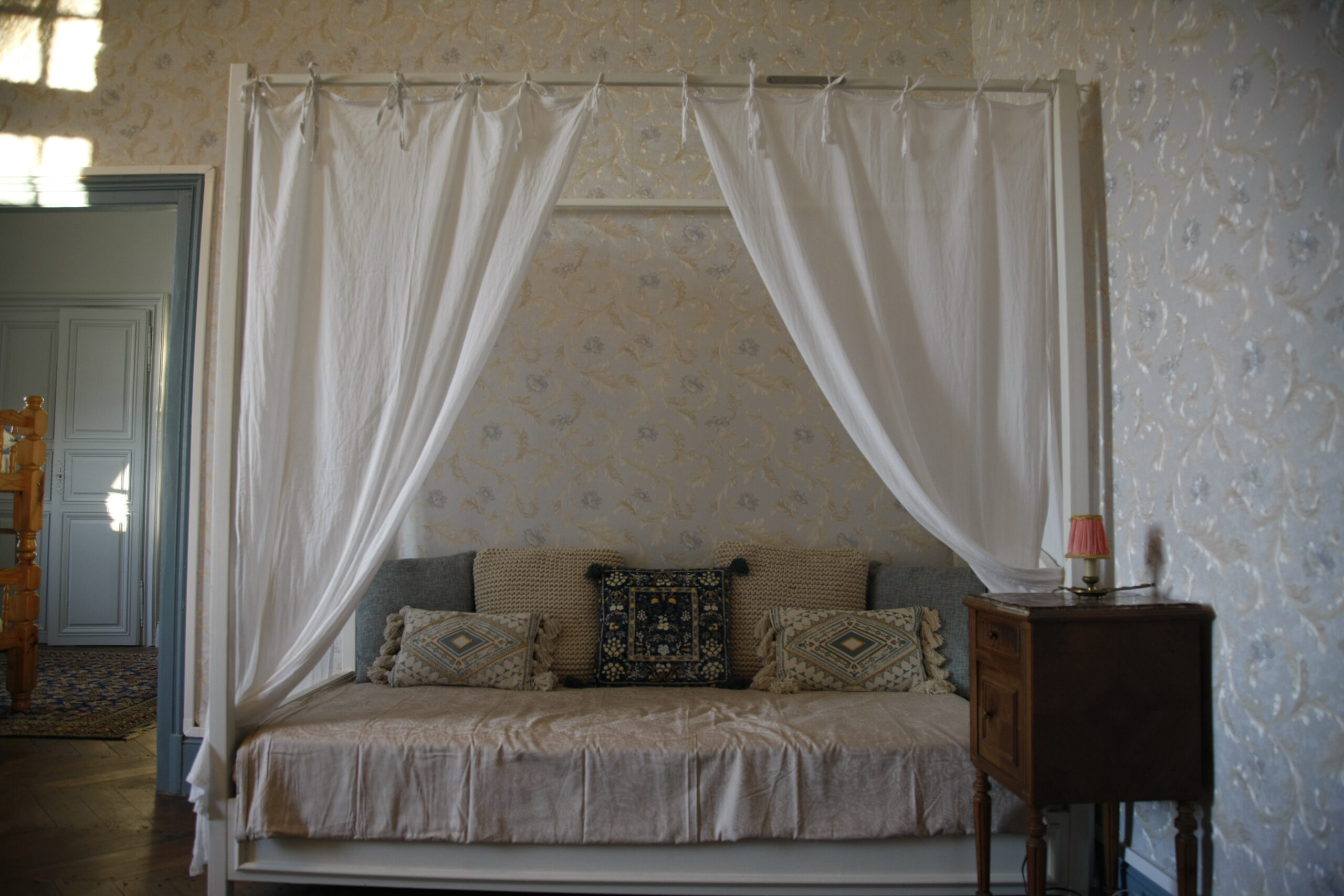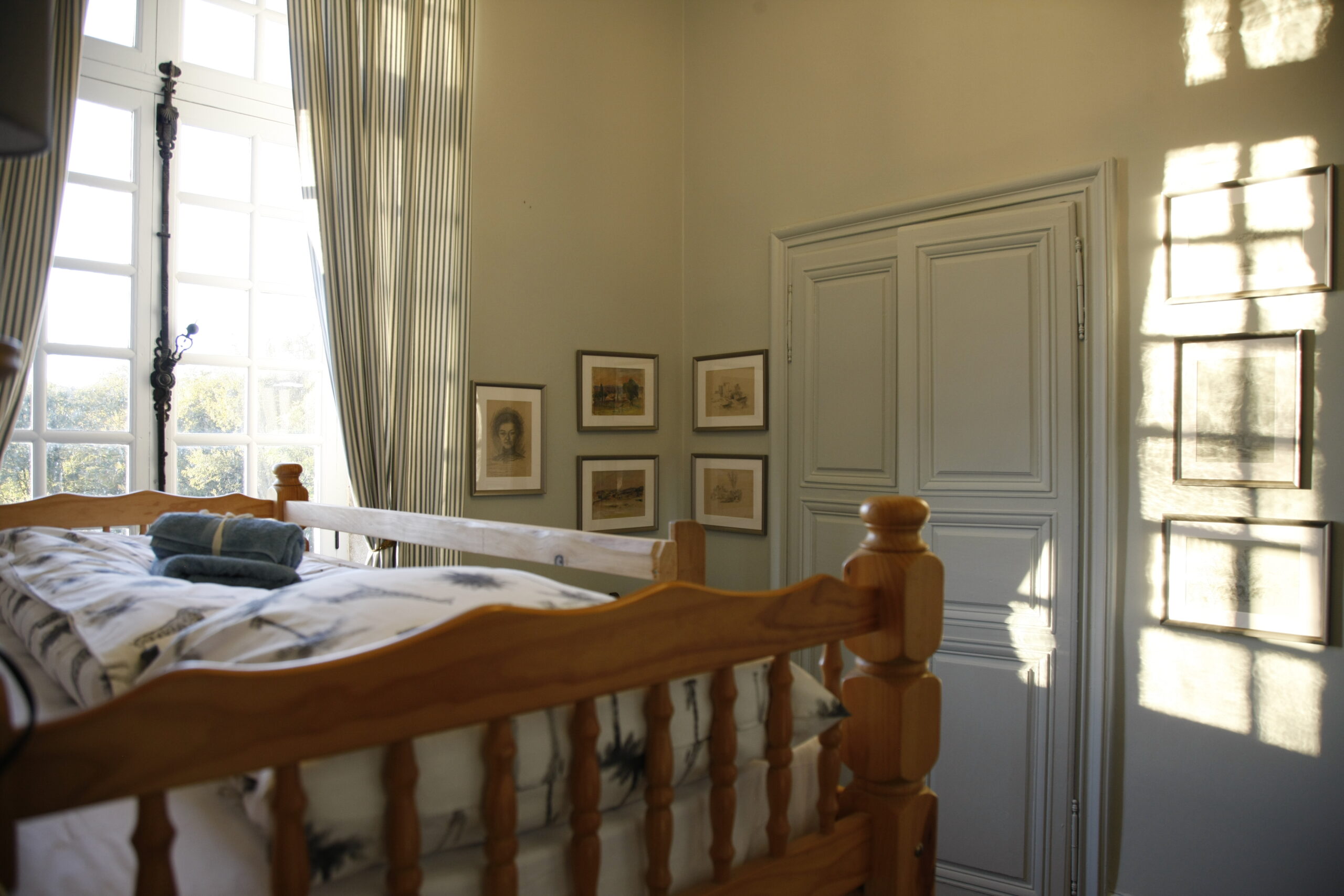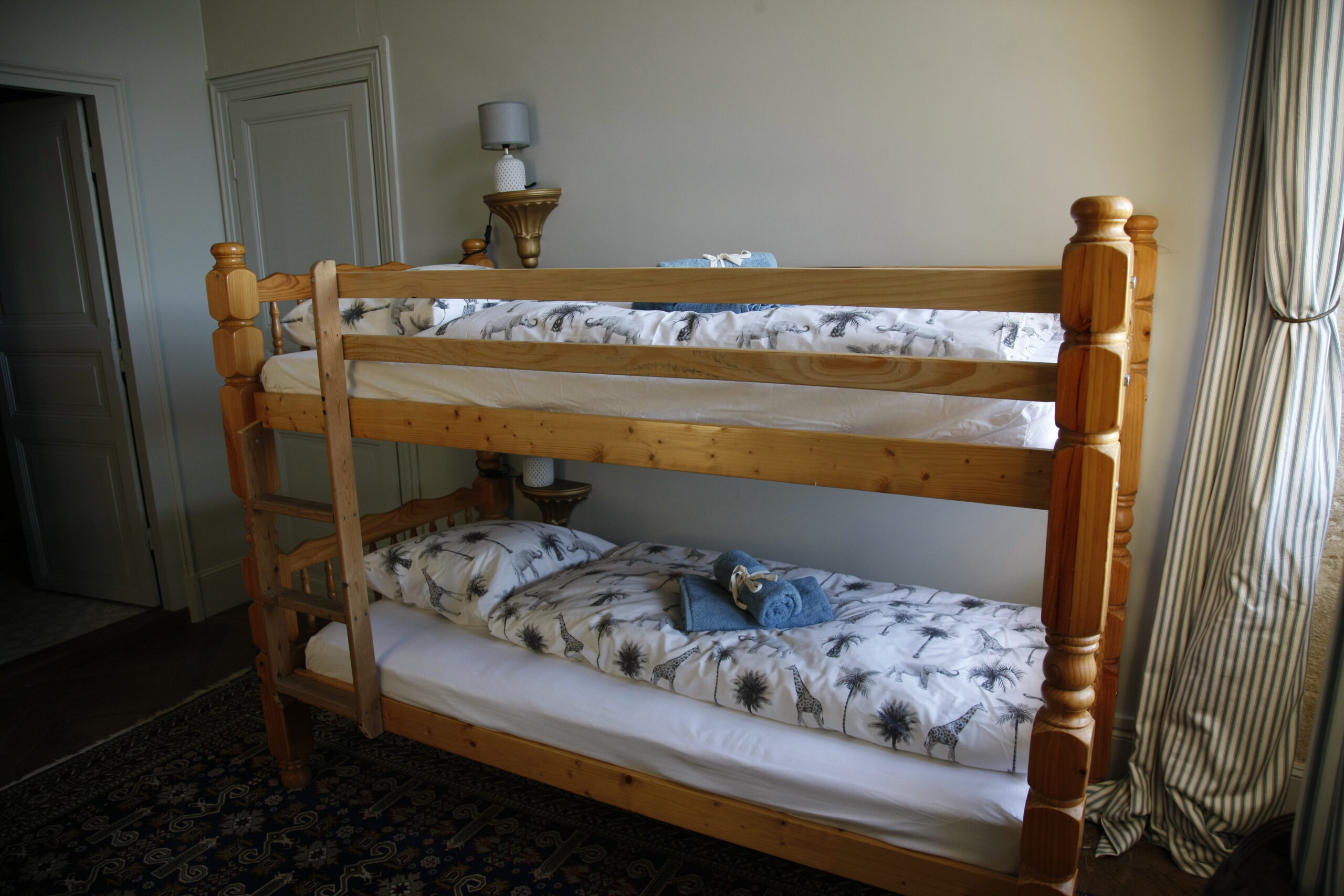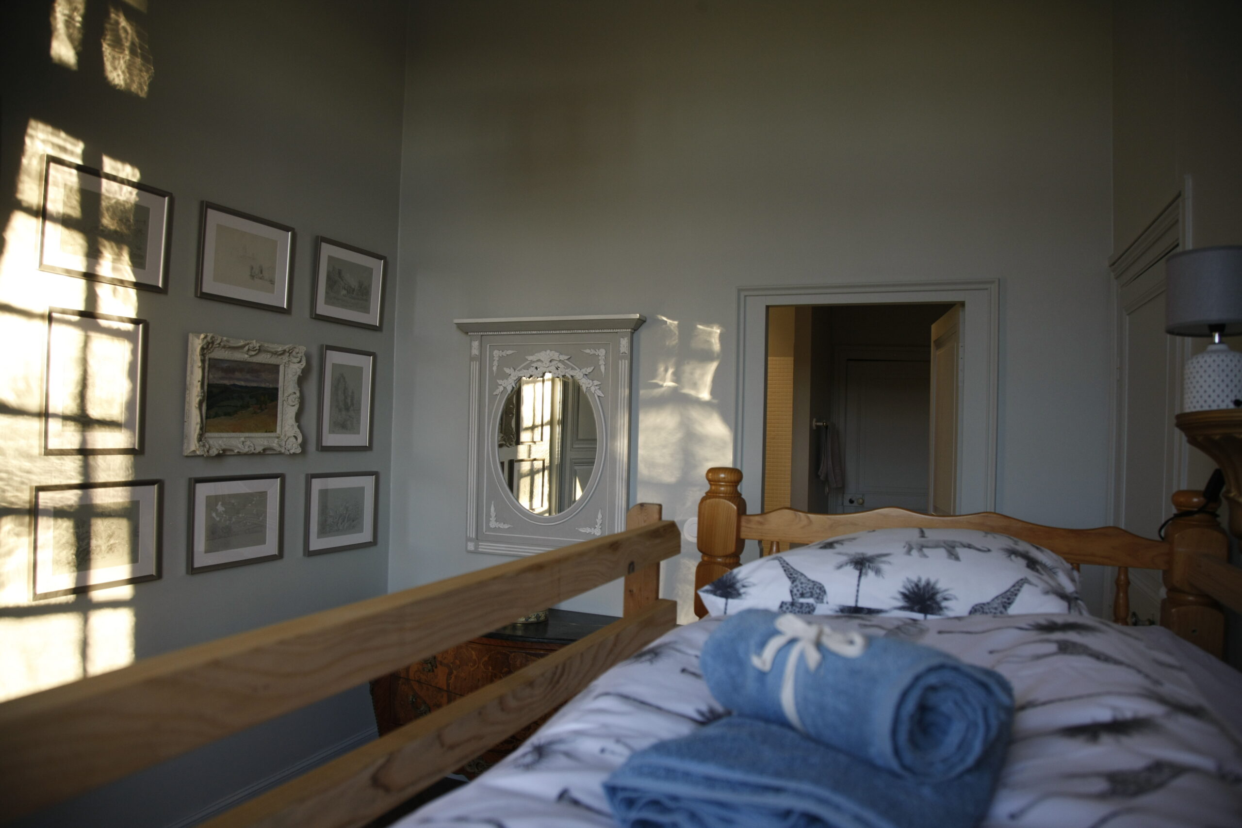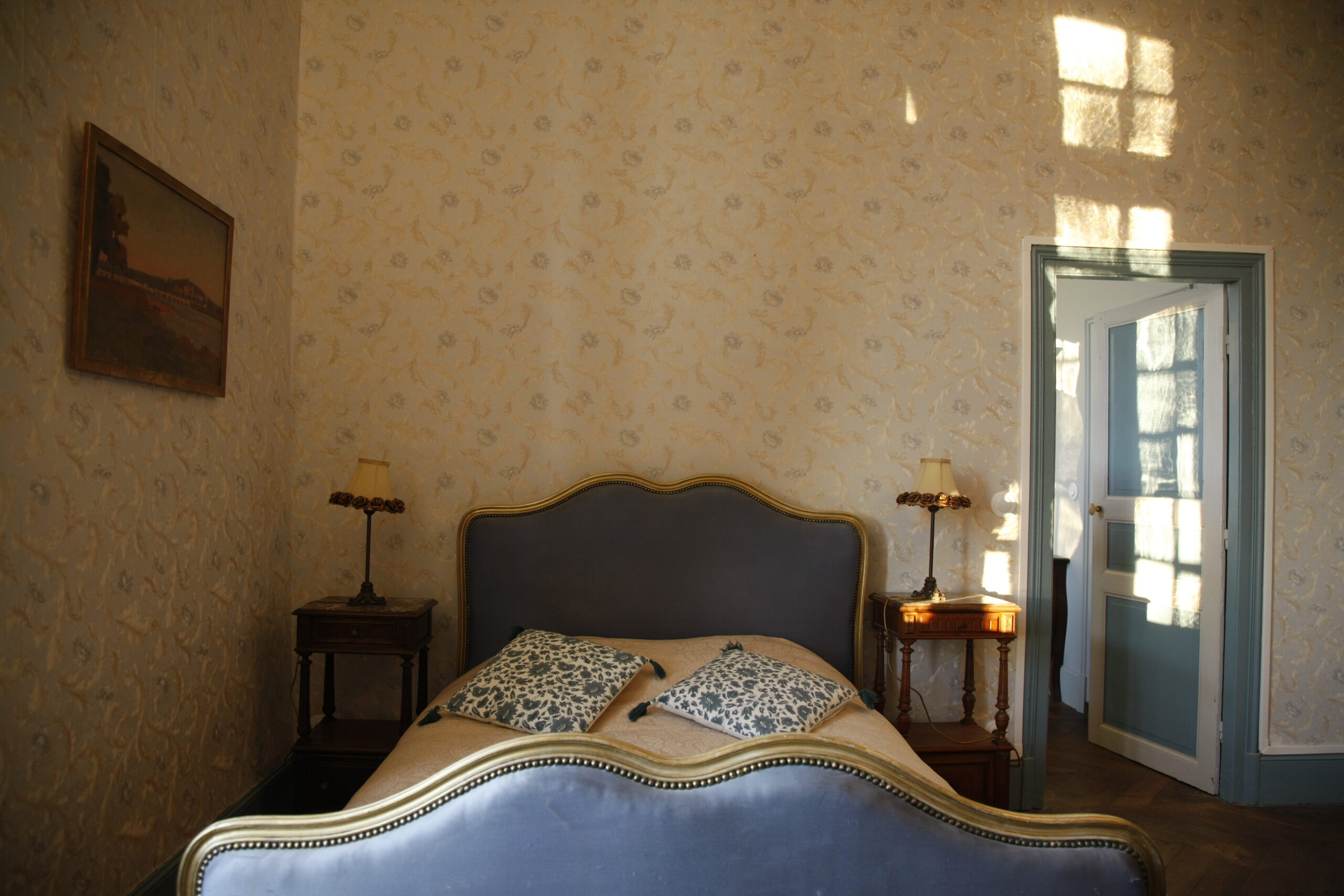 This spacious and heated suite comprises a large bedroom (27 m2) for three people (a double bed consisting of two divisible single beds, 180 cm) and a four-poster bed (90 cm), a smaller bedroom (14 m2) for two people (with bunk beds), as well as a bathroom with shower, toilet and washbasin. The two bedrooms with parquet floors face west, with a view of the castle park, the waterfall and the lake. They are equipped with wall cupboards, chests of drawers, armchairs and, as a decorative element, a disused fireplace.