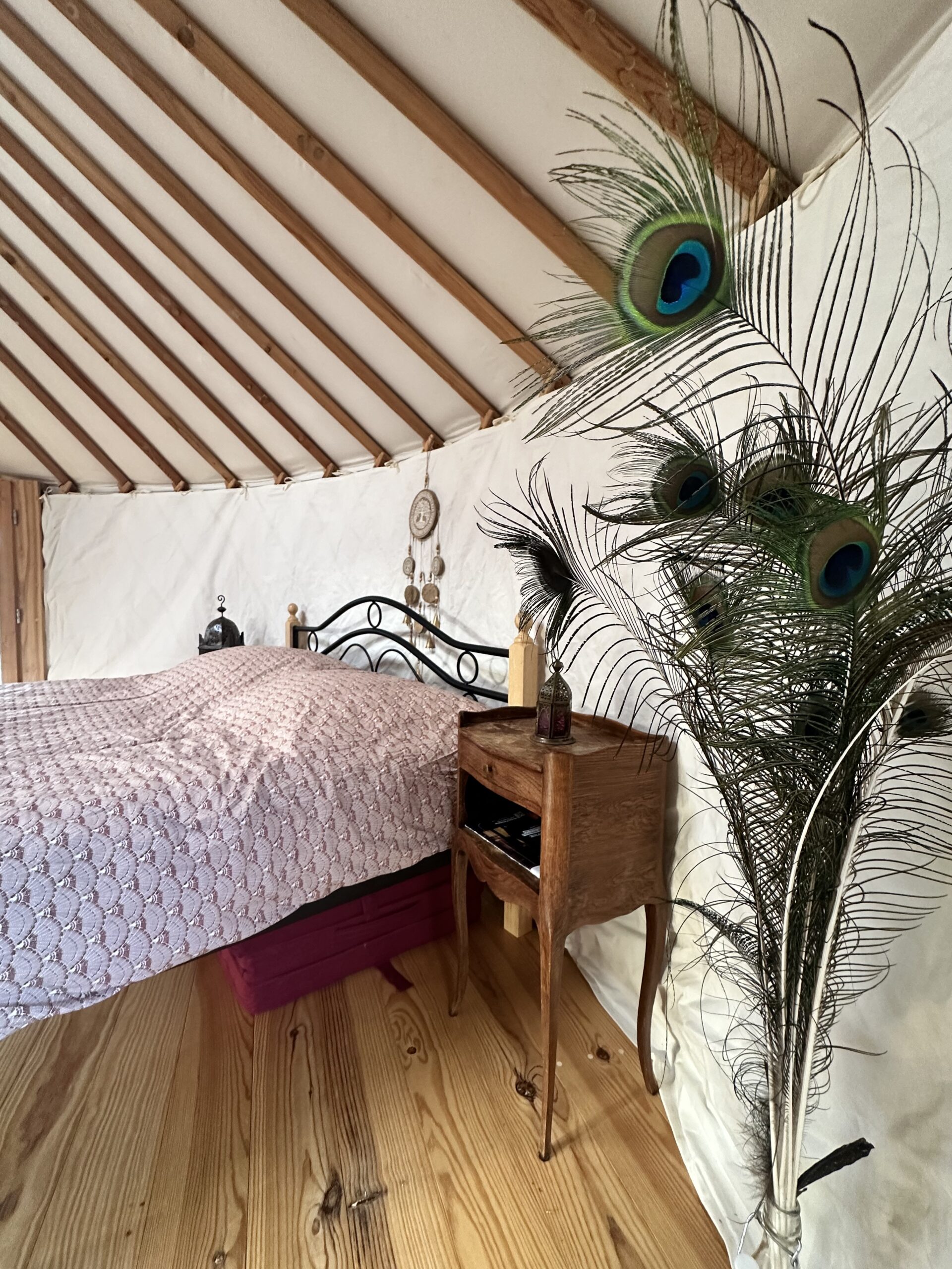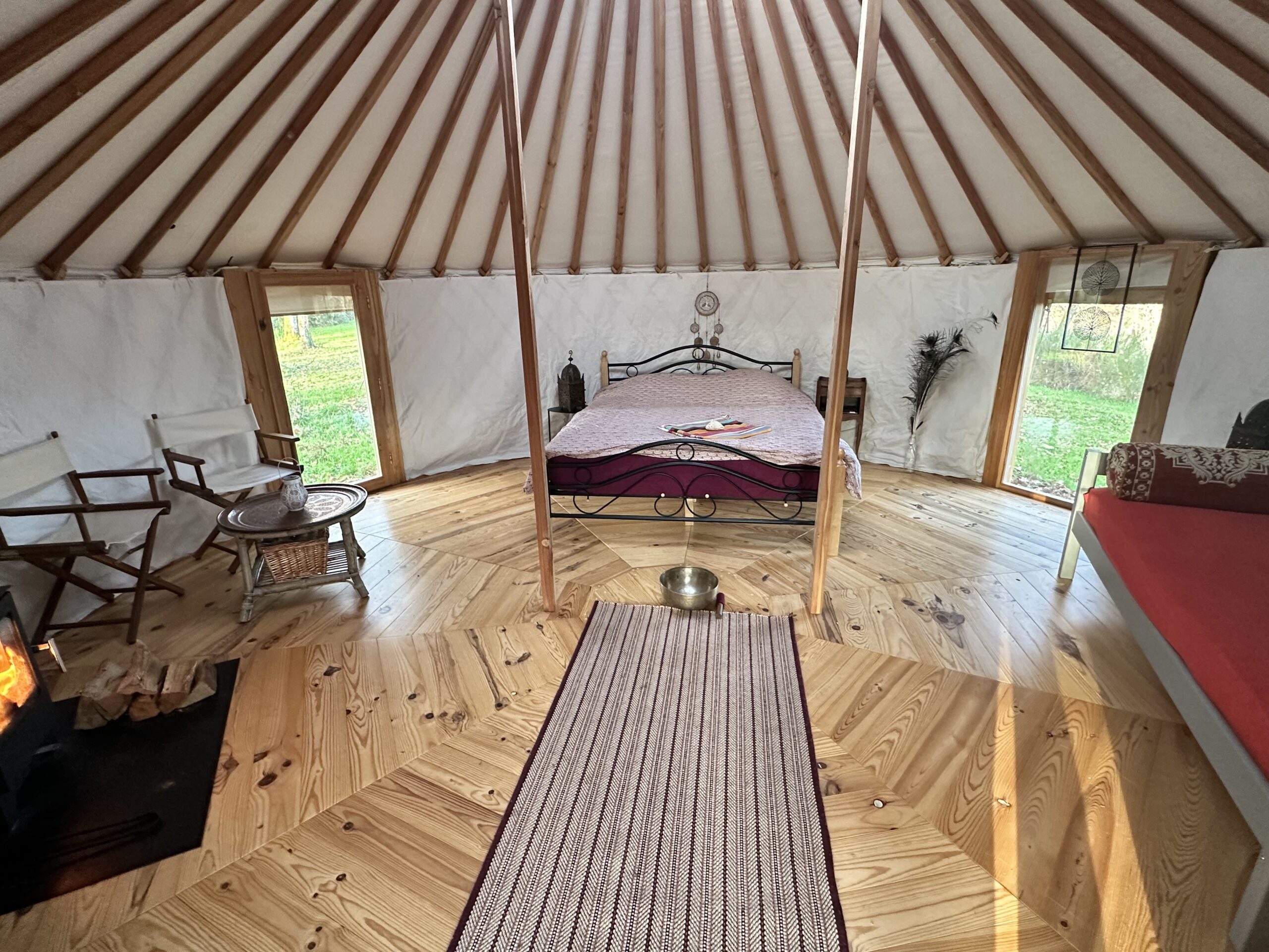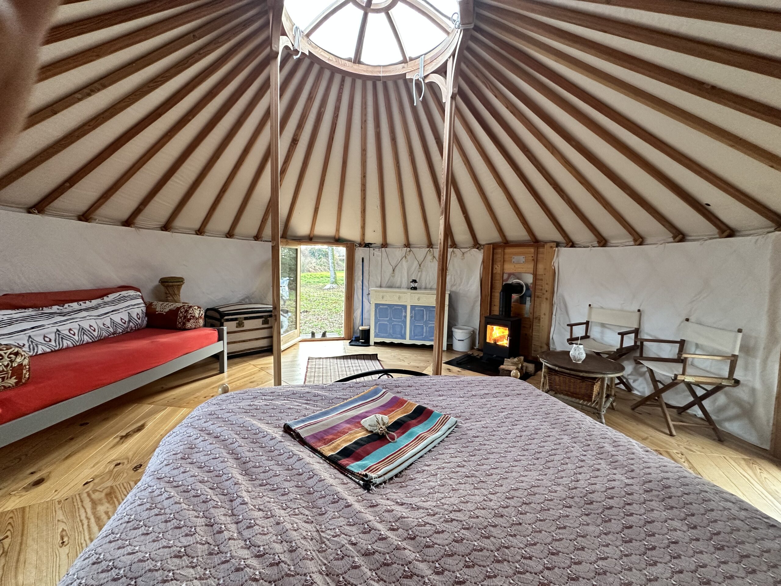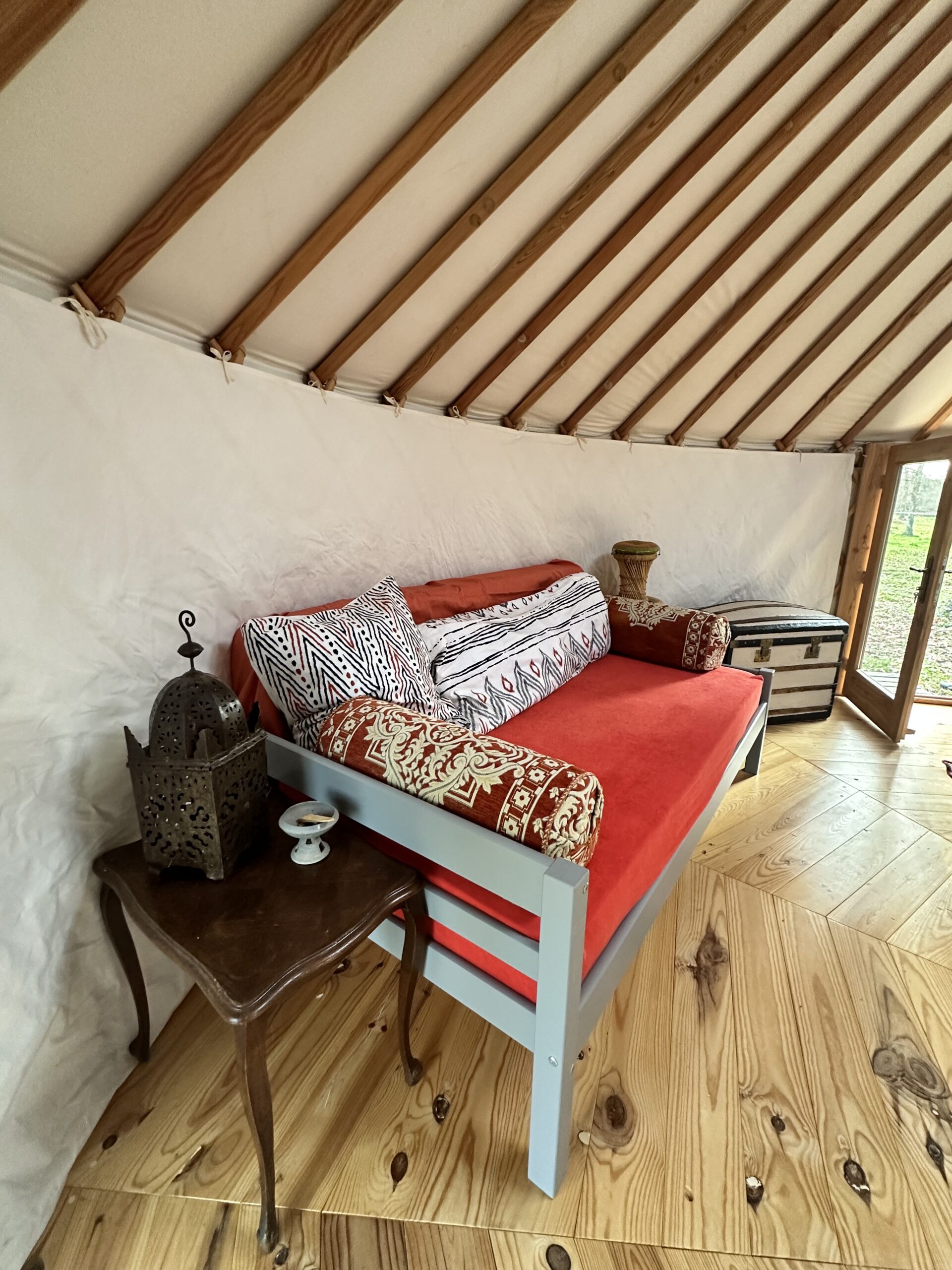 The Yurt “Soleil” is embedded in the forest of the castle surrounded of wild birds, deers and pheasant. This round shaped room with a 160×200 bed and a sofa that can also be used as a 90×200 bed. It has two chairs and a small table. There are two windows, one that can be opened and one that cannot. It has a composting toilet 10 meters away.