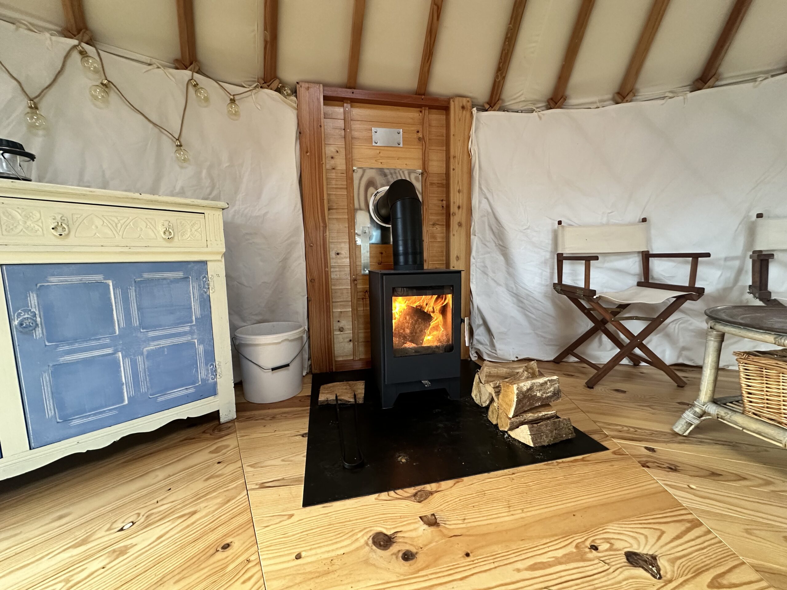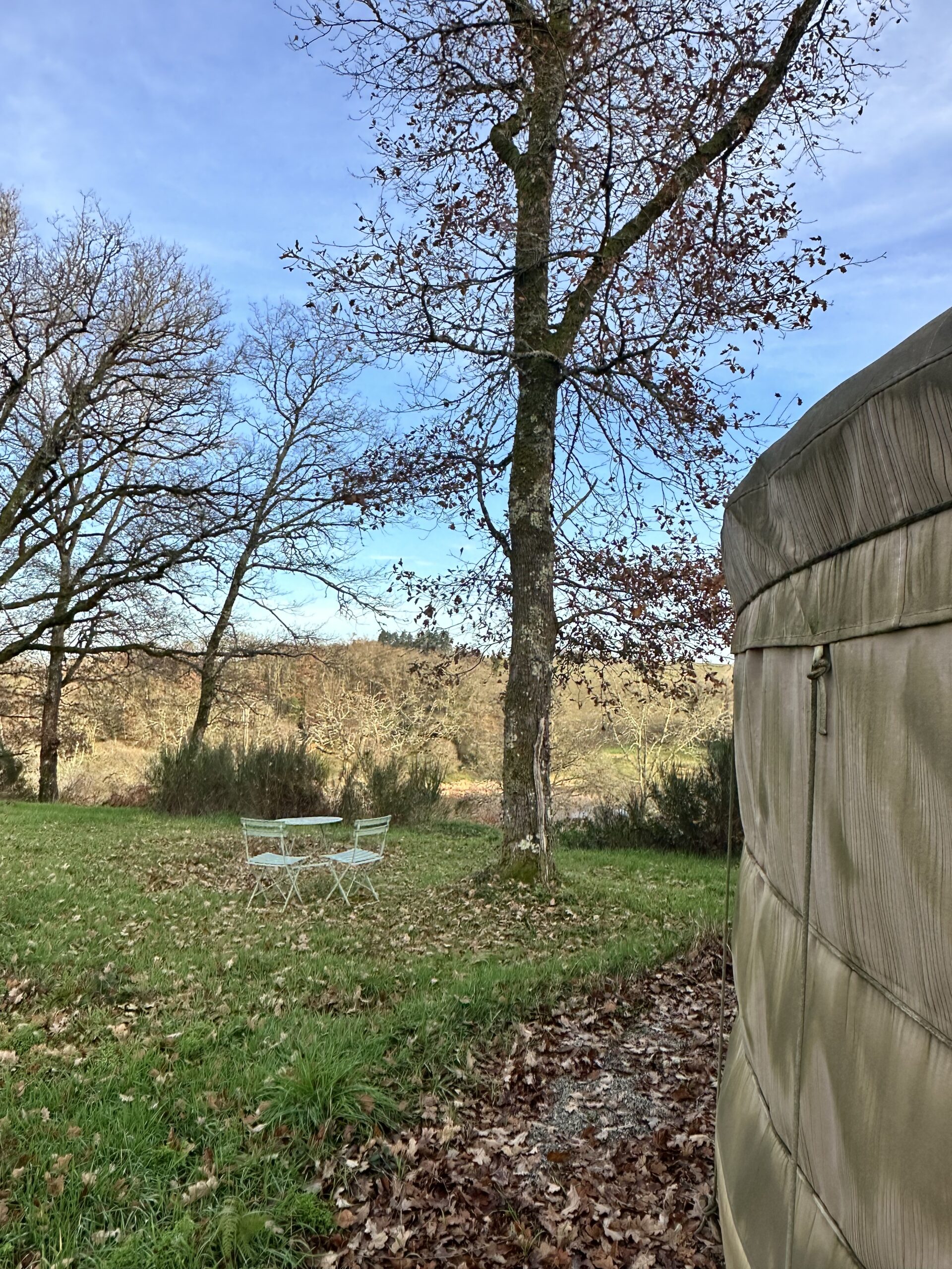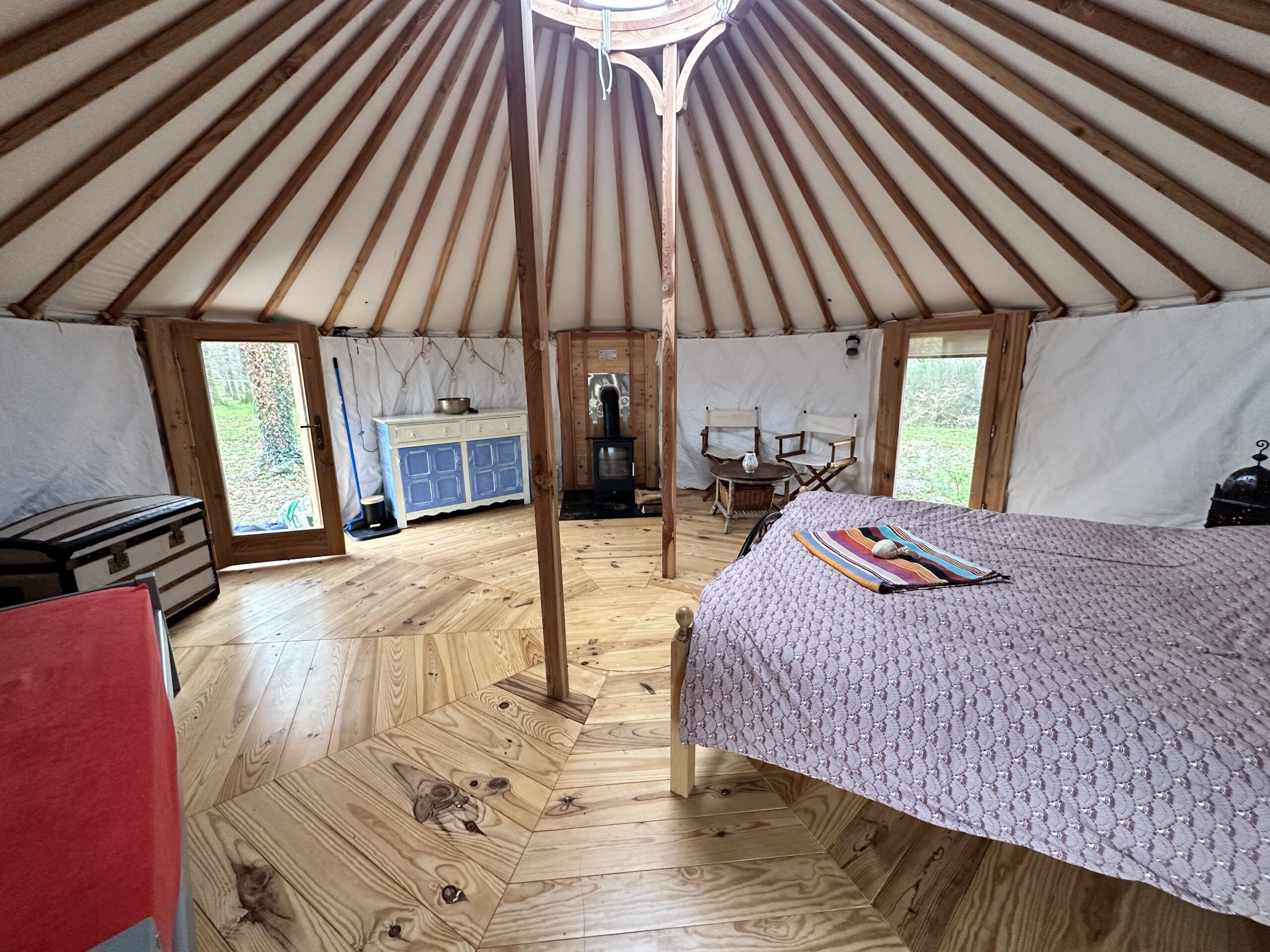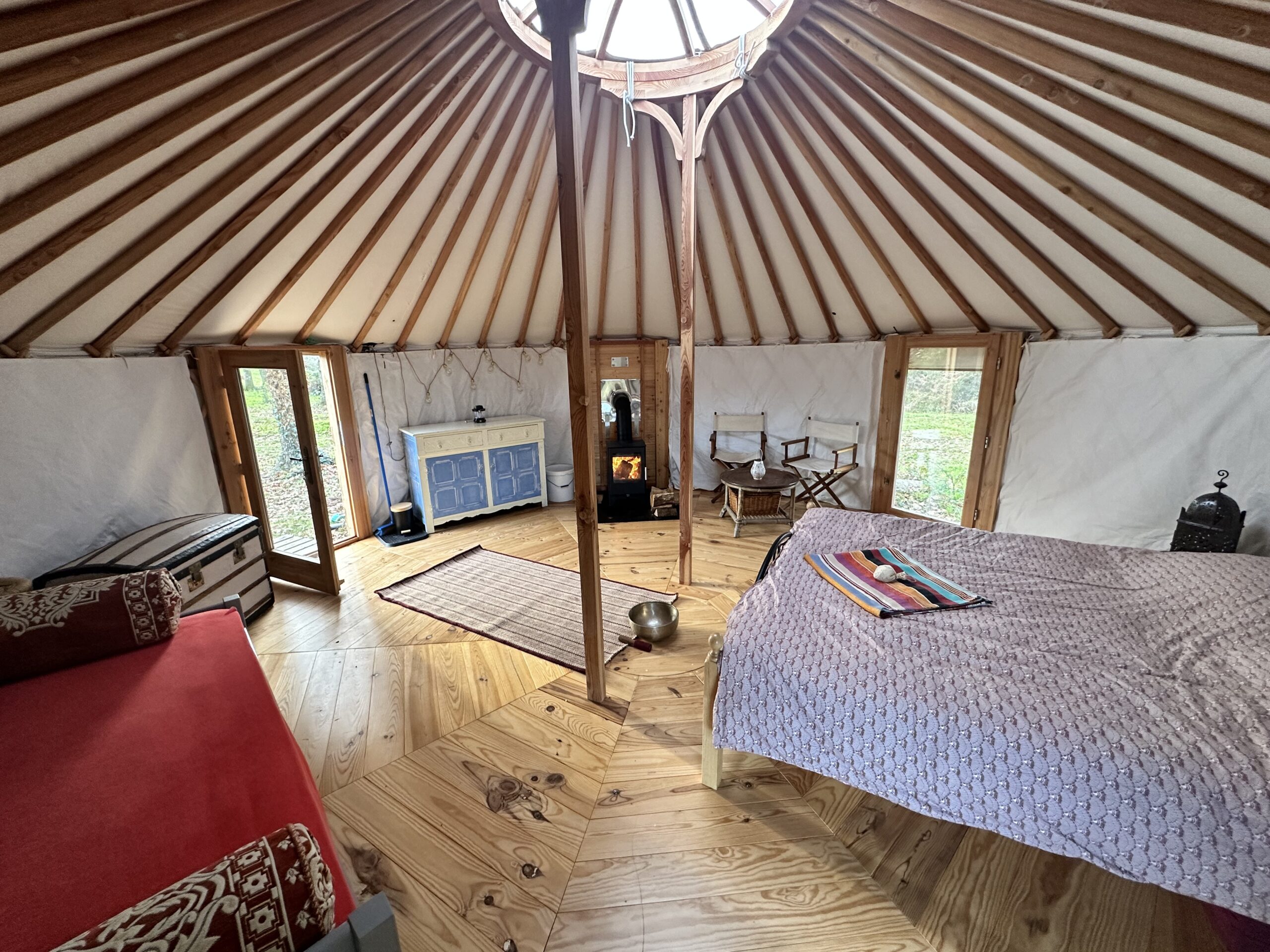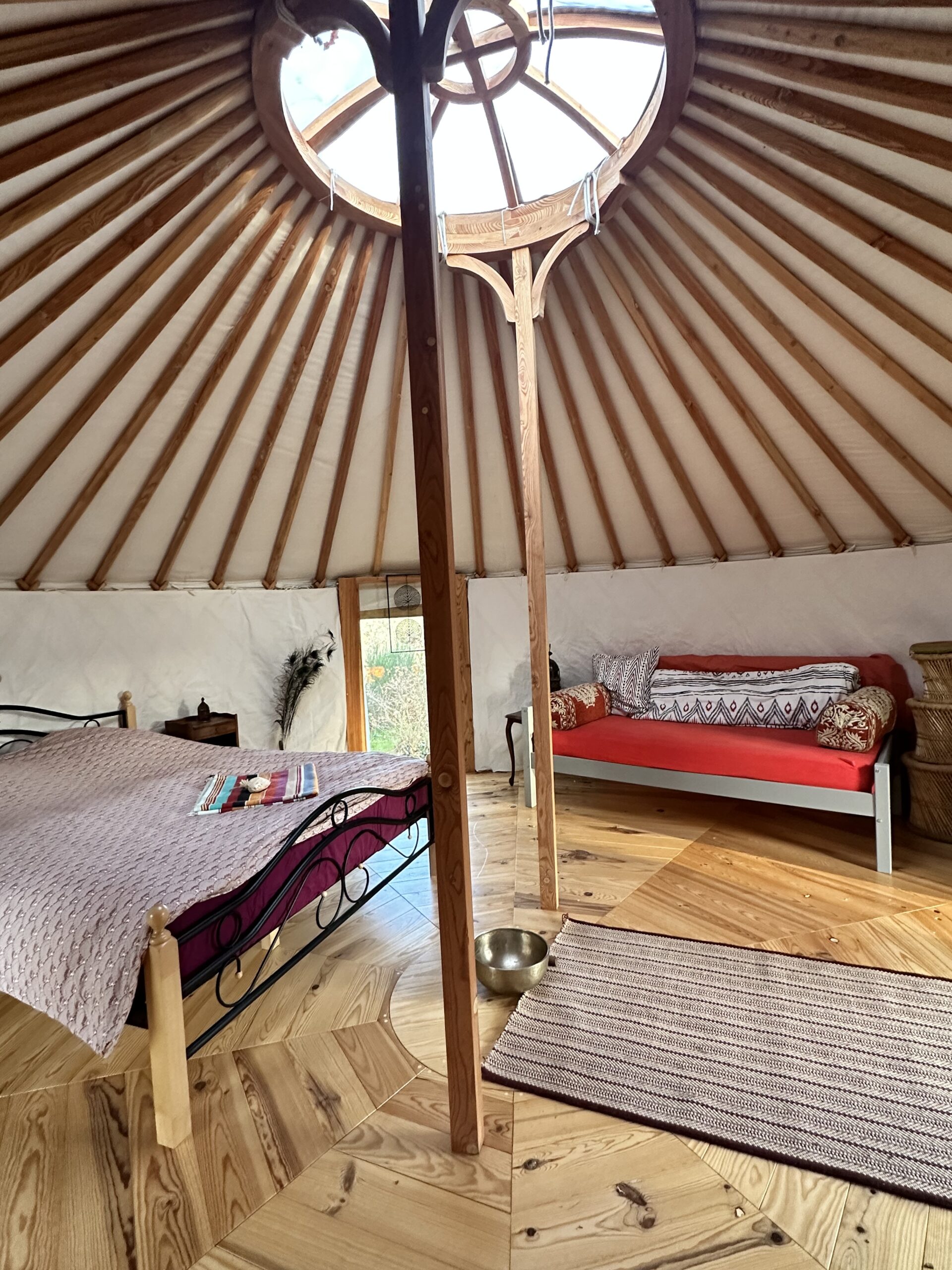 The Yurt “Soleil” is embedded in the forest of the castle surrounded of wild birds, deers and pheasant. This round shaped room with a 160×200 bed and a sofa that can also be used as a 90×200 bed. It has two chairs and a small table. There are two windows, one that can be opened and one that cannot. It has a composting toilet 10 meters away.